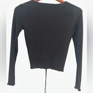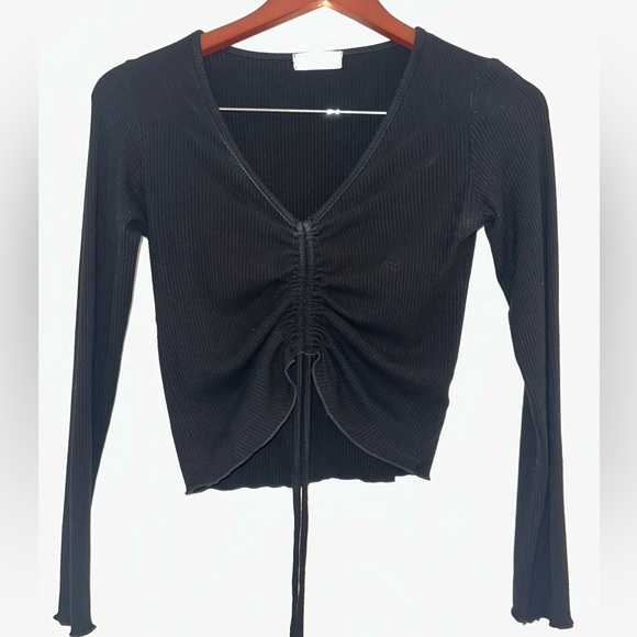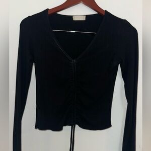 Black crop top with synching chords that can tie into bow. Very flexible material