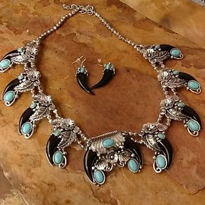 Fantastic Native American styled Bear Claw Squash Blossom Necklace Earrings Set. This Southwestern beauty is a significant weight. Black faux bear claws, faux turquoise, and silver tone concho, flowers, leaves, feathers & beads. Matching bear claw earrings. Don't blend in with the crowd! Stand out with this incredible piece of jewellery.