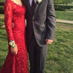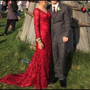 I can post other pictures if needed! But it is genuine lace with a beautiful train, pretty much as seen in pictures! I have only worn this once (to my prom) even though I am in love with it, it isn't doing any good in my closet! It is a custom order which includes a button and loop to reduce the train (like bridal dresses) Ask any questions(: let me know if you're interested, at least, and I can figure out a way to get you this magnificent dress!!π bust: 34 waist: 26 hip: 35
