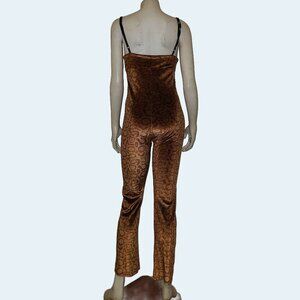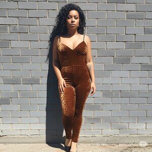 This stylish jumpsuit features a rich two-tone brown velvet fabric with a subtle, eye-catching pattern.