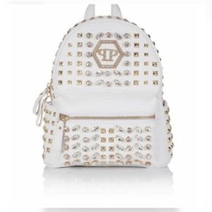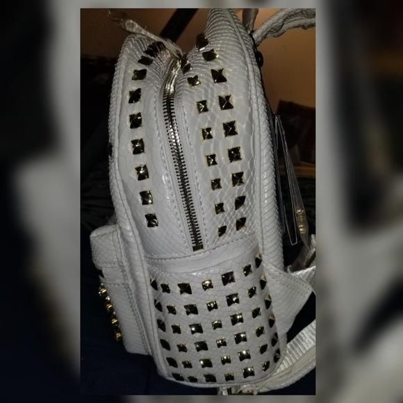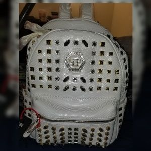 White skin python pattern printed backpack .Adjustable shoulder straps and zipped opening. Quilted back. Crystals and metals studs decorating the item. Fully lined internal pockets. Used a handfull of times, but still in good condition. A few studs missing. No box or dust bag.