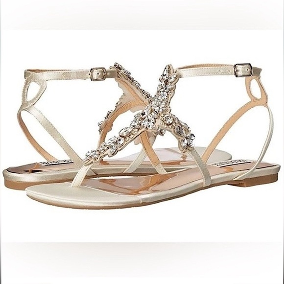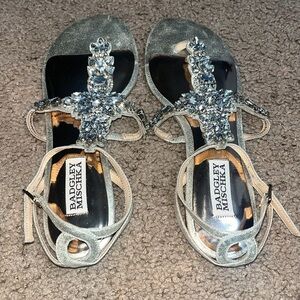 BADGLEY MISCHKA Cara II Crystal Embellished Flat Sandal Rhinestone Bling 7. These sandals are perfect for your beach or semi casual wedding or when your feet get tired of your heels. Round-toe thong sandals with adjustable ankle strap and buckle closure. Rhinestone embellishments at vamp. Leather upper; manmade sole. Great pre-owned condition. No stains/flaws. Smoke/pet free home. Offers welcome. Bundle & save. Ship same/next day. Packaged w/ care.
