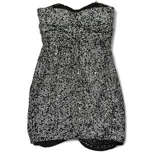 Features: Strapless . Sparkly black & white sequins. Faux wrap design. Boning on bodice . Fully lined. Back zipper closure,
