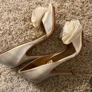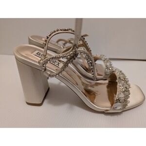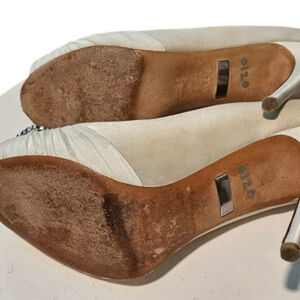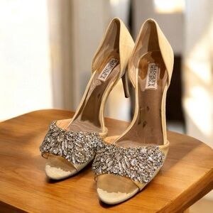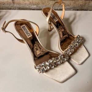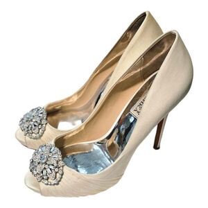 BADGLEY MISCHKA Cream Embellished Satin Peep-toe Pump. Size 71/2 M