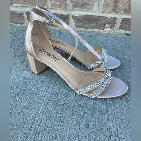 BADGLEY MISCHKA AMERICAN GLAMOUR LOW BLOCK HEEL SANDLE FOOT STRAP ANKLE STRAP BUCKLE 9.5