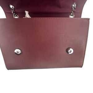 Has wine Burgundy exterior color and matte. The bag is made of faux leather and features a magnetic snap closure, crossbody strap, and tassel logo accents.