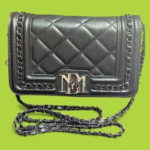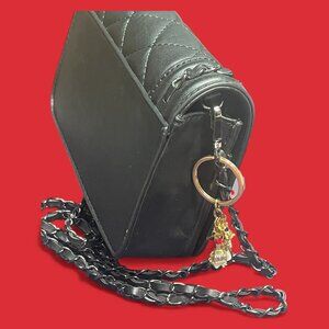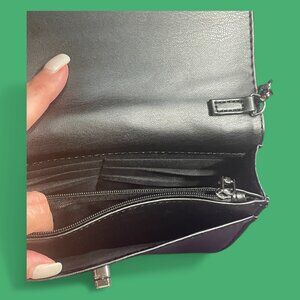 NWOT - Pristine - vegan leather with elegant black quilted design. Gun mental strap detail and hardware. Chain strap is clipped, therefore can be shoulder bag or clutch! Turn lock closure - inside cards slots and zipper pouch plus pocket for your phone.