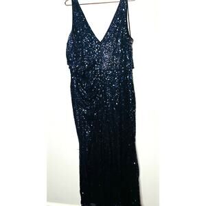 BADGLEY MISCHKA Women's Black Blue Sequins V-Neck Mesh Ombré Astor Gown Size 16.This elegant gown features a dramatic ombré design with black sequins transitioning to blue at the hem. The V-neckline and sleeveless silhouette create a sophisticated look, while the mesh overlay adds a touch of allure. The fitted bodice with a hidden back zipper ensures a flattering fit, and the flowing skirt with a front slit adds movement and drama.