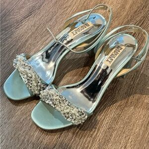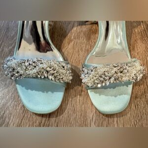 BADGLEY MISCHKA Womens Teal Faux Pearls Clara Toe Block Heel Heeled Sandal