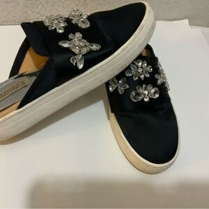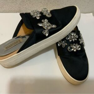 BADGLEY MISCHKA SATIN JEWELED MULES, RUBBER SOLES 6.5