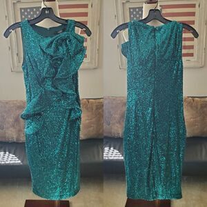- Sequin cocktail dress in peacock with Ruffle Trim