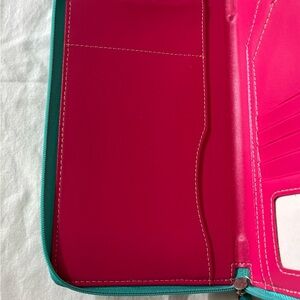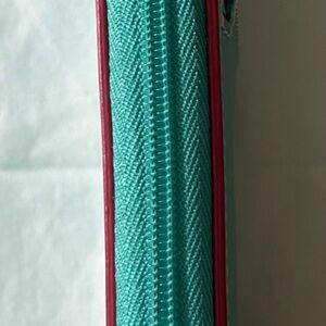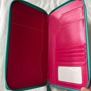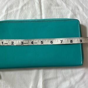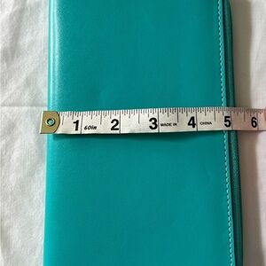 Stylish turquoise wallet with sleek design. Perfect for organizing essentials and travel.