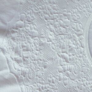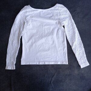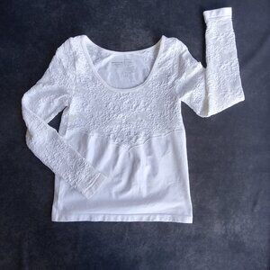 Bagatelle Women's Minimalist White Floral long sleeve top. Tight fitted stretchy comfortable material sleek top. Scoop low neck chest. Flower sheer cut out details on the bust and sleeves. Size S/M