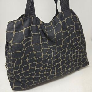 The BAGGALLINI Giraffe Shoulder Bag in black is a stylish and practical tote purse with three sections and pockets, perfect for travel and casual occasions. This large rectangular bag features silver hardware, a zip and magnetic closure, and double black nylon handles with a 7-inch drop. The exterior is made of water-resistant nylon with a matte finish, showcasing an animal print giraffe pattern, while the interior is lined with green nylon and includes inner dividers, pockets, and a credit card holder for organization. This lightweight bag is both fashionable and functional for everyday use.