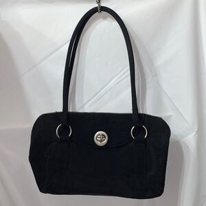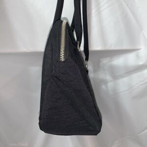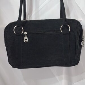 Baggallini Black Satchel With khaki liner Zipper for main compartment and twist clasp on secondary. 8” tall, 10” wide, 3.5” deep with 2 handles with 10” of drop. A couple of spots on liner. See photos.