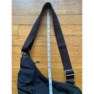 BAGGALLINI Black Slim Nylon Crossbody Bag. Featuring an adjustable crossbody strap, multiple interior/exterior pockets, embossed logo zipper pulls, magnetic snap closures and top zipper closure. Due to the shape of the bag it is meant to be carried on your left side or left front. Perfect for traveling or for everyday use.
