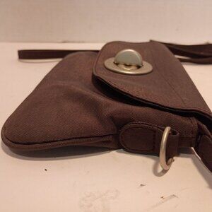 From BAGGALLINI, a brand with a loyal following, this small gray nylon convertible wristlet/clutch with detachable crossbody strap. This little pouchette has a flap closure with twist lock clasp. Chunky zippers, pocket on the back, opens to red lined compartment. Measures 9" wide by 5" tall and an inch deep with wristlet strap and crossbody strap. I do not believe this bag has been carried. The crossbody strap had definitely not been used and the bag still had a hanger tag attached. As clean as it is, it's easy to believe it is brand new without tags. Please see photos.
