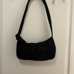 Sleek and versatile shoulder bag. Perfect for everyday use. Comfortable strap for easy carrying. This bag is like new, I carried it 2 times. It has 2 from pockets, inside has 1 zip pocket and the key leash. Bag is clean, stain and odor free. Comes from smoke free home.