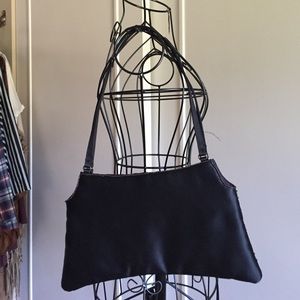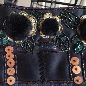 Black satin like material with bronze sequins, iridescent beads and soft black Pompoms. Back is simply black. Pocket inside back. Two straps that stay on shoulder.
