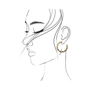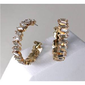 Expand your jewelry collection baguette rhinestone hoop earrings. This hoop earring has baguette stone on the edge on a gold frame.