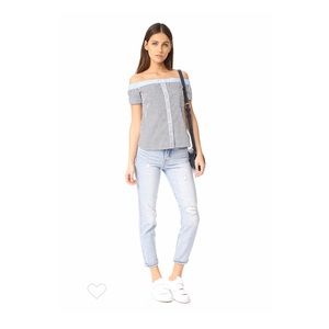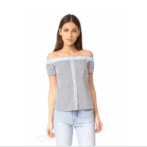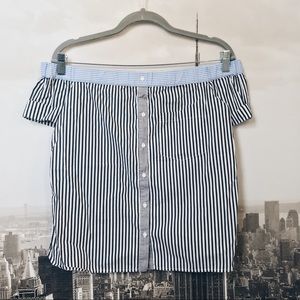 A striped Bailey44 top, detailed with a contrast, covered-elastic band at the off-shoulder neckline. Button closures at the front and back. Patch breast pocket. Short sleeves.