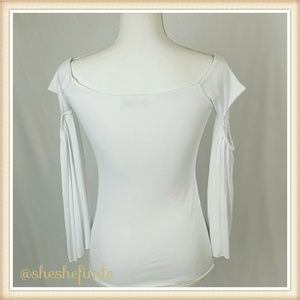 New, without tags. White beautiful designer top has captivating cold shoulders and flowy trumpet sleeves! Great stylish white top by Bailey 44 has a lining with a double layer of cotton fabric. Goes with everything!