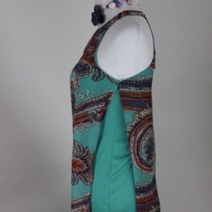 BAILEY BLUE Teal, Blue, Purple, & Orange Paisley Halter Style Sleeveless Double Layer Women's Dress, Size Small. This stylish dress has a beautiful teal, blue, purple, and orange color hue, paisley print, halter-style neckline, sleeveless detail, double layer design element with a short underdress and long overdress, open sides, and a keyhole opening with two button closure on the back neckline. Measurements are: UNDERDRESS: L = 30", B = 30", W = 30"; OVERDRESS: L = 56", B = 32", W = 46".