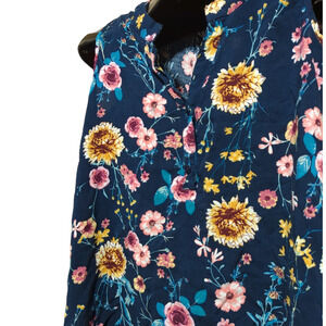 Black sleeveless quarter button top with a beautiful floral pattern in yellow, pink and teal.