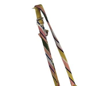 Pink, yellow, green and white strip maxi dress. High neck, sleeveless, adjustable strap dress. Chevron detail on bodice, vertical stripe on bottom, along with a single wide ruffle along hem. Lined and has a thin belt.