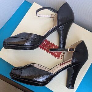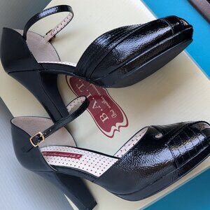 These have been worn once for about 20 minutes. They are a size 10 but fit like a size 9.5. They are in amazing condition and no longer being made. They have a peep toe, sturdy heel and an ankle strap. They have a 4" heel and slight platform and ship with original box from a smoke free home. They have a great rockabilly, retro, pinup vibe.