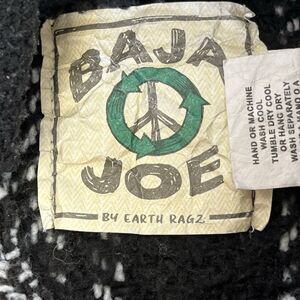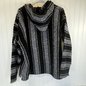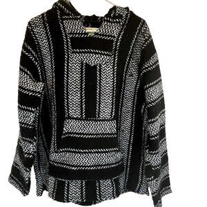 BAJA JOE by Earth Ragz Mexican Hoodie, This size large, black and white striped pullover features a versatile V-neck design and long sleeves, making it an ideal choice for a variety of outdoor activities from hiking to skateboarding. The hoodie comes from Earth Rags' Drug Rug product line and is adorned with a hood and front pouch pockets, providing both functionality and style. NOTE SEE PHOTO FOR FOR 2 SMALL SNAGS WHICH IS COMMON FOR THIS FABRIC.