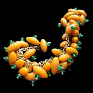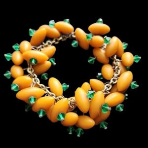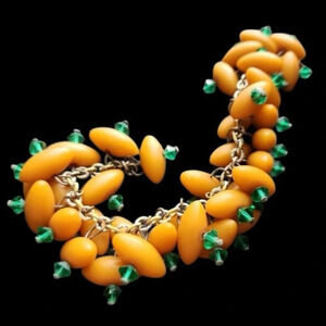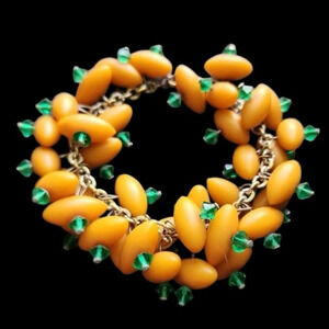 BAKELITE 1930s Vintage Butterscotch Orange Beaded & Green Crystal Cluster Fruit Salad Bracelet TESTED