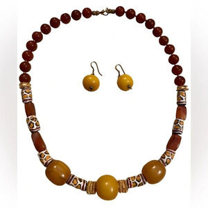 BAKELITE & Mixed Media Vintage 1940s Matched Set Butterscotch Earrings & Beaded Necklace