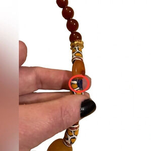 Because of the pattern, even facing forward, it’s hard to notice the damaged bead because your eye is drawn to the other colorful beads on the necklace.