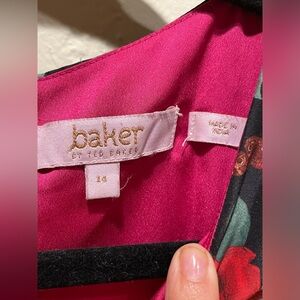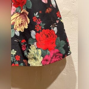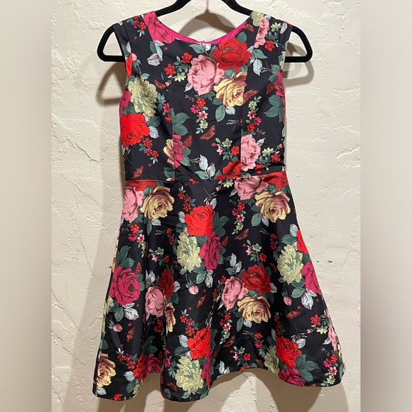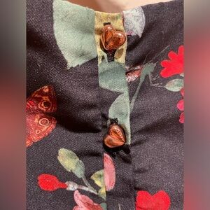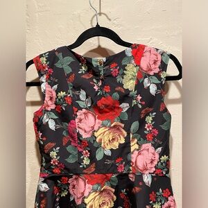 Black floral with two adorable metallic heart buttons on back of neck. A line with small fit and flare styling.