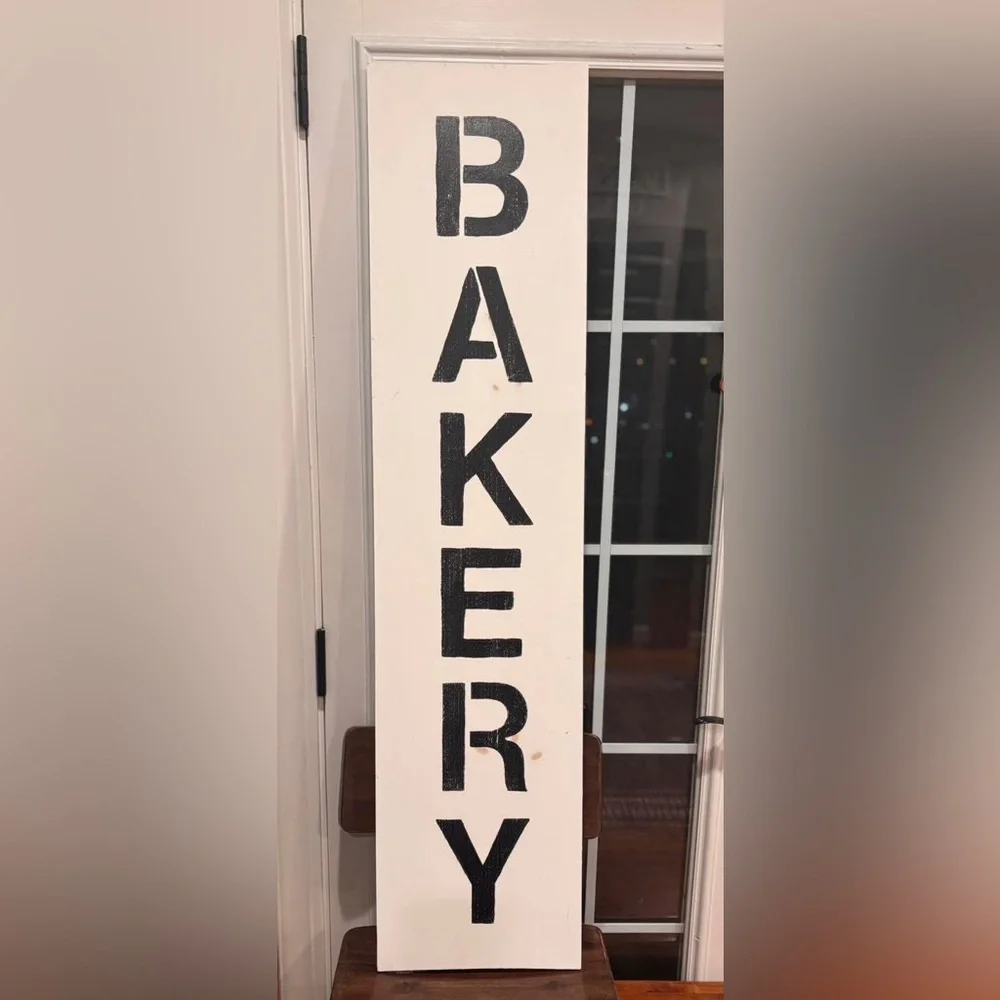 Vertical wooden sign with bold "BAKERY" lettering. Clean white background with black painted letters. Rustic farmhouse style. Ready to display.