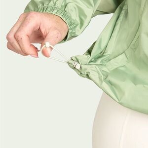 Features a half-zip design, front pockets, elastic wrists and a cinch pull closure.