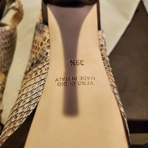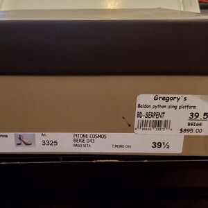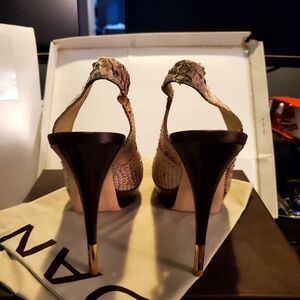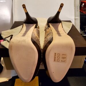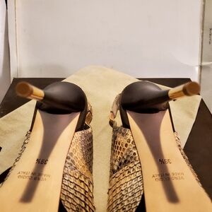 Brand new, never worn, in box, with dust bag, these STUNNING, chic, chic, chic BALDAN python sling platforms with gold tipped stilettos. These stilettos are TO DIE FOR!!! They are expertly made, insanely comfortable, and tirelessly chic. The python is butter soft, the color palette is extremely versatile and the gold tip accent on the stilettos screams money, high end, Uber Chic!! If I could still wear stilettos I would never part with these These are a MUST have!! So so comfortable and just a master class in workmanship and style. Retail for $895.