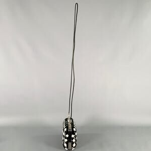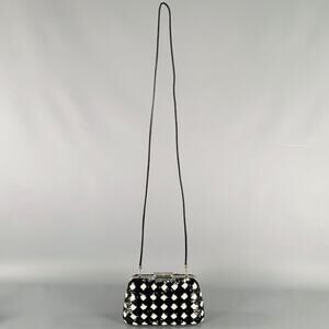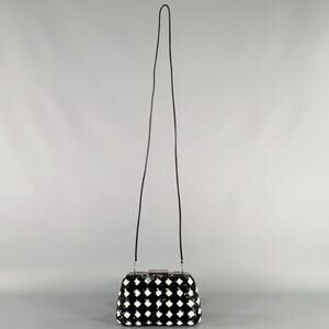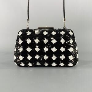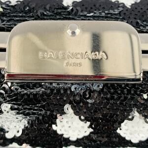 BALENCIAGA handbag in a black and white sequined material featuring a mermaid sequined design with polka dots, removable crossbody strap, and silver tone metal clasp closure.