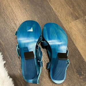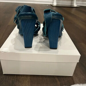 Blue leather Balenciaga ankle strap sandals with tonal stitching, wooden heels and buckle closures at uppers. Includes box.
