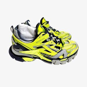 The sneakers feature a striking color combination of neon yellow and gray. This bold color combination creates a dynamic and eye-catching look, making them a statement piece for any outfit.