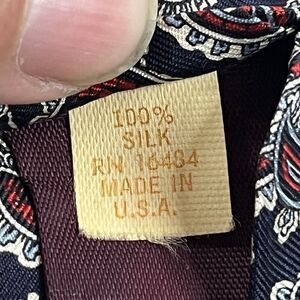 The product is a vintage Balenciaga Paris neck tie in red, beige, and blue paisley silk. Made in the USA, this designer tie is crafted from 100% pure silk and features a unique paisley pattern with adjustable sizing. Measuring 58 inches in length, the tie showcases quality craftsmanship and attention to detail, making it a stylish and sophisticated addition to any man's accessory collection.