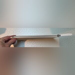 Designer, BALENCIAGA makeup bag. Leather slide in pocket on front. Full zippered closure top with pull tag. Soft and pliable. Lined interior. Like new condition.