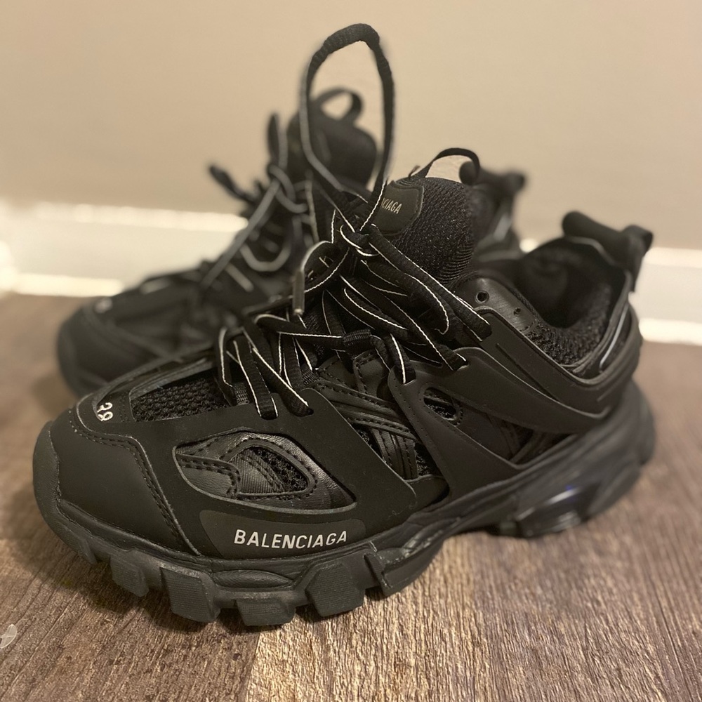 ALL BLACK BALENCIAGA RUNNERS W/ BALENCIAGA SHOE BAG & BOX. BLACK WITH WHITE TRIMMING