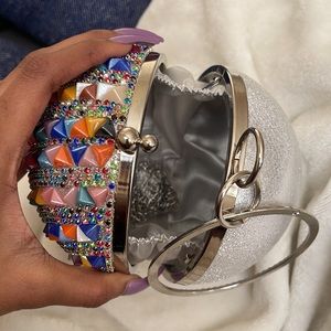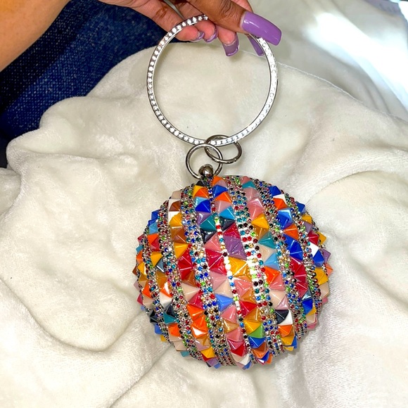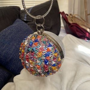 Colored gem and stone ball clutch. Has chain strap to be worn as a crossbody for versatility. Deep inner pouch for essential items. Perfect for date night or brunch.