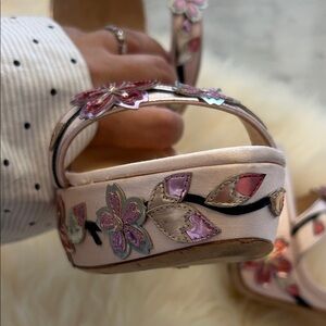 Step out in style with these beautiful unique Italian made pink floral heels from the luxury brand Ballin. Perfect for any occasion, these shoes feature a stunning floral design that adds a touch of sophistication to your outfit. Chunky platform for height and comfort. Unique. Pictures don’t do justice.