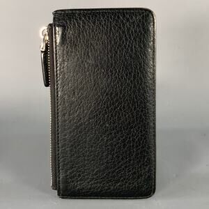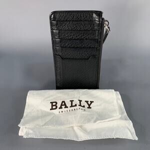 BALLY wallet in a black leather featuring multiple card slots and coin purse with zip closure.