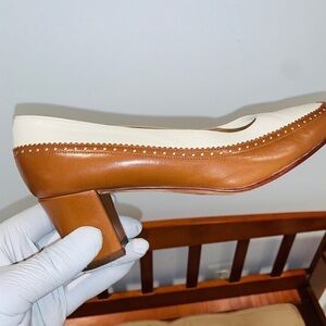 BALLY "Locle" Ladies Pumps . Elegant ladies BALLY "Locle" pumps / heels. Marked size 6 C. Uppers are a mix of buttery brown and Ivory leather with decorative brogue detailing in between. Lined with silky calfskin. 2 3/8 inch block heel. Made in ITALY. EXCELLENT condition.