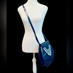 This vintage Bally navy leather bag is both unique and rare. It has a distinctive side-curved body design and a triangular magnetic-closure flap that displays an intricate cutout design in a beautifully contrasting bright white leather. The original strap is both adjustable and removable, allowing the bag to be worn 3 ways - as a crossbody bag, shoulder bag, or clutch. Truly a stunning and unique vintage piece! Made in Italy