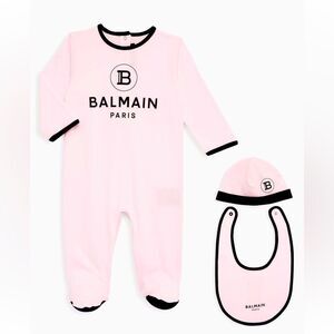 Crafted of soft luxurious cotton, this three-piece set includes a footie, a beanie, and a bib with the Balmain logo. 100% cotton. Machine wash. Made in Italy.
